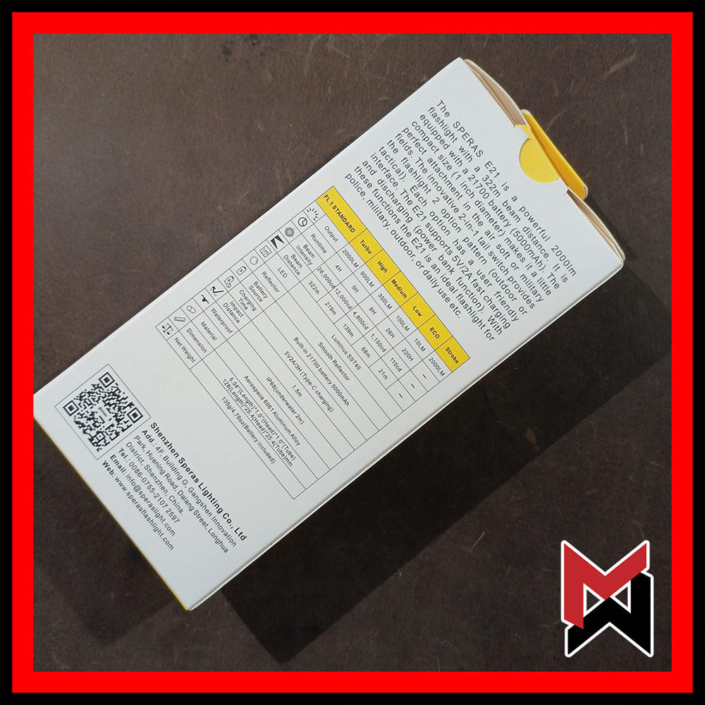 The SPERAS E21 is a powerful 2000lm flashlight with a 322m beam distance. It is equipped with a 21700 battery (5000mAh).The compact size (1 inch diameter) makes it a little perfect attachment in the air soft or military fields. The innovative 2-in-1 tail switch provides the flashlight 2 option patterns (outdoor or tactical). Each option has a user friendly interface. The E21 supports 5V/2A fast charging and discharging (power bank function). With these functions the E21 is an ideal flashlight for police, military, outdoor, or daily use etc.